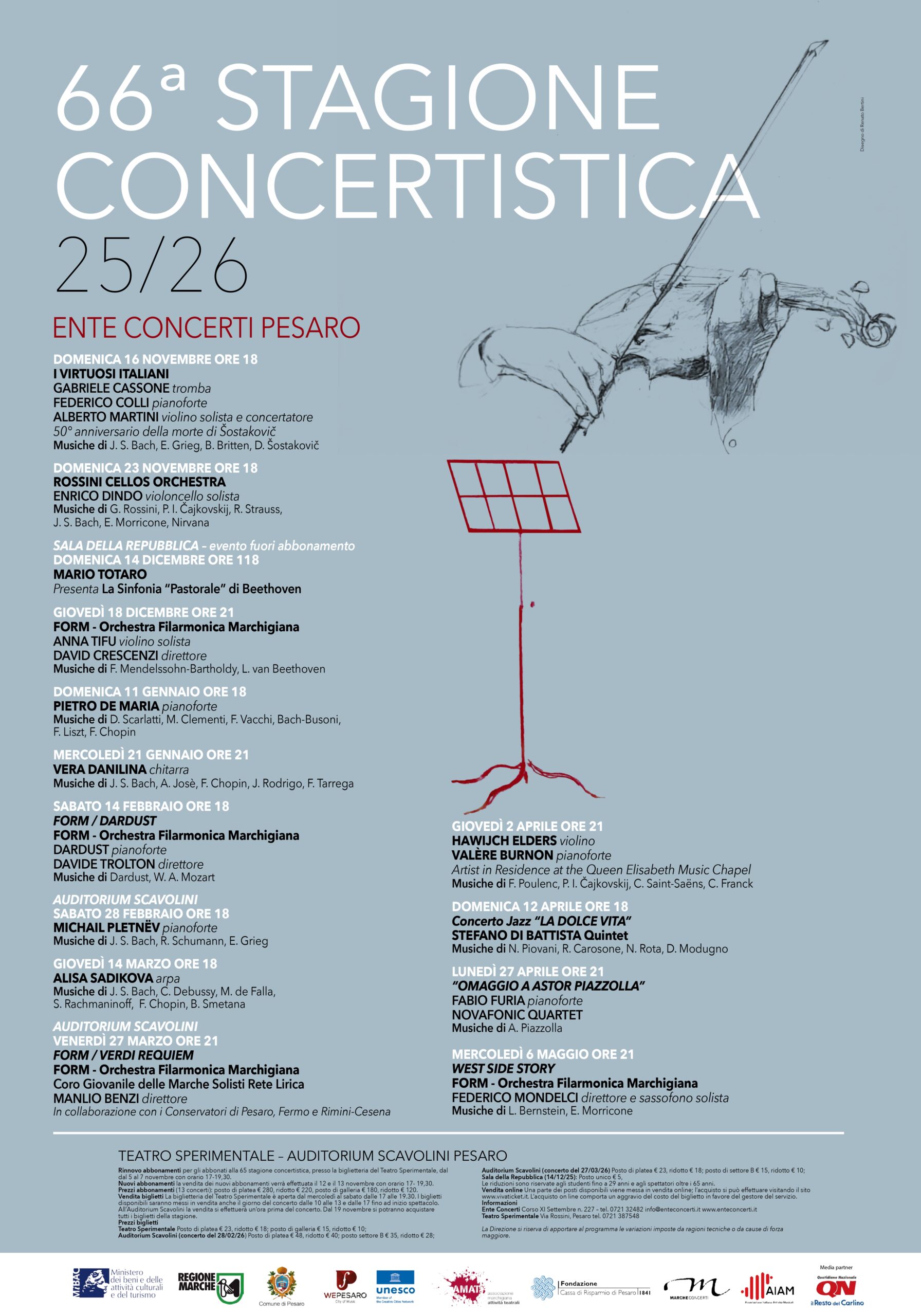Auditorium Scavolini (concerto del 28.02.2026) Posto di platea € 48, ridotto € 40; posto di settore € 35, ridotto € 28.