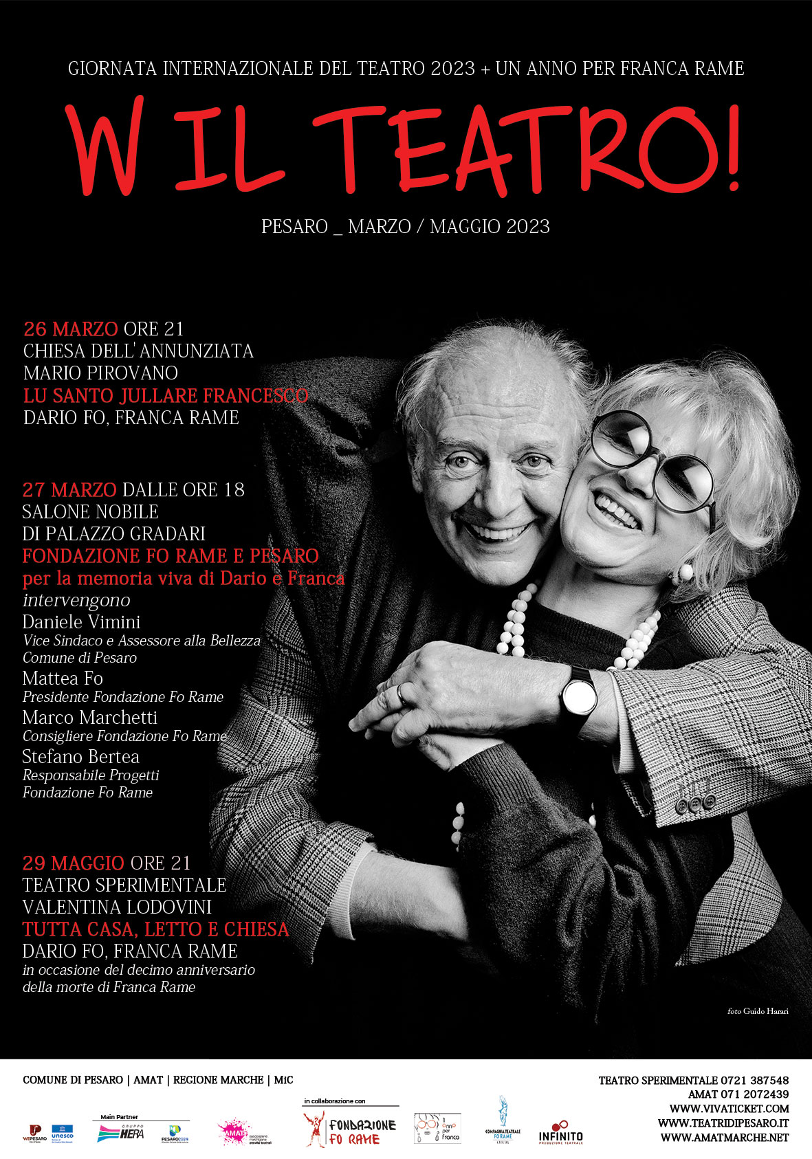 In occasione della Giornata Internazionale del Teatro e del decennale della scomparsa di Franca Rame, Comune di Pesaro e AMAT in collaborazione con la Fondazione Fo Rame organizzano W il Teatro!, tre appuntamenti il 26 e 27 marzo e il 29 maggio per celebrare la memoria viva di Dario Fo e Franca Rame, artisti eclettici di talento istrionico che hanno segnato la storia del teatro del secondo Novecento, esempio straordinario di impegno civile e politico.